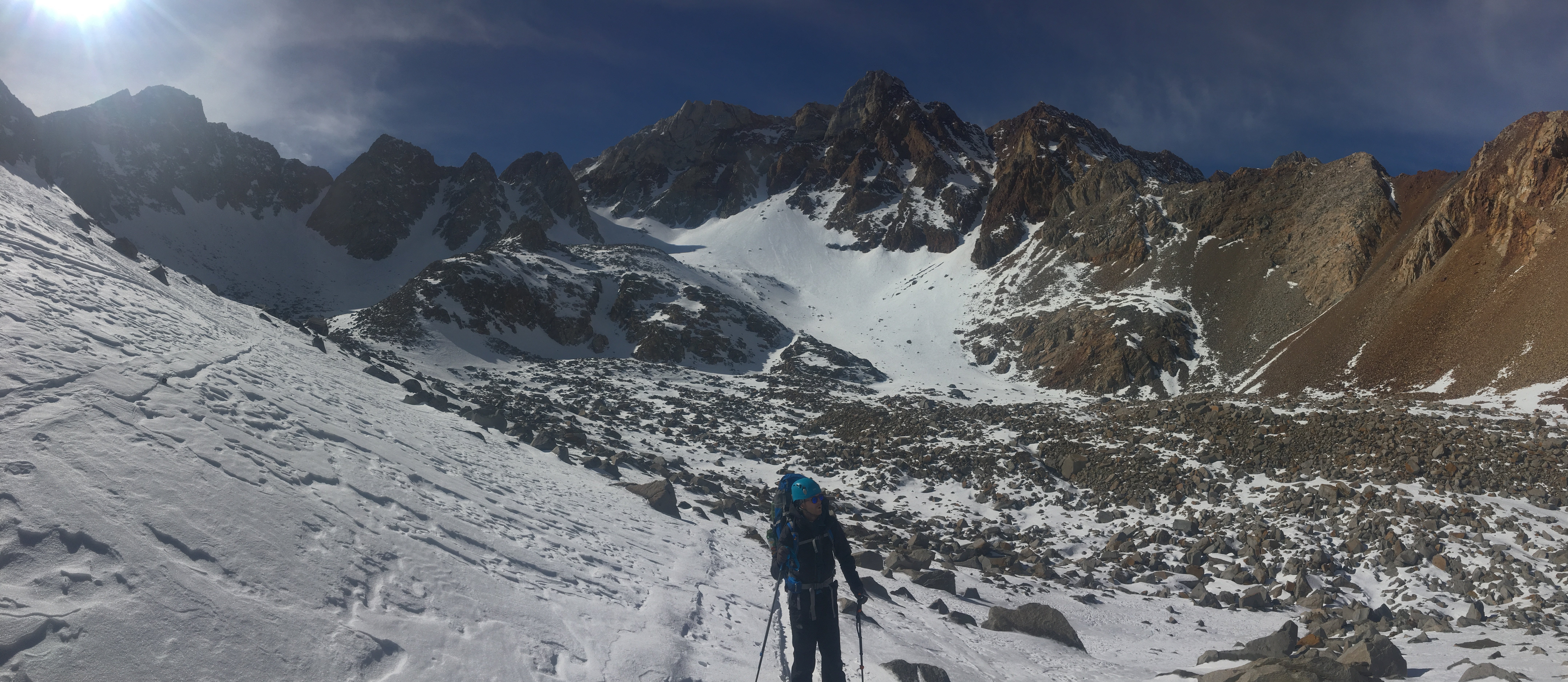 Back at our gear, we skinned up and walked to the base of the SE couloir to set up camp. Like a genius, Ben had brought hot chocolate, and I had got some free snacks from Patagonia at outdoor retailer so we ate well which helped with how horrible snow camping is.